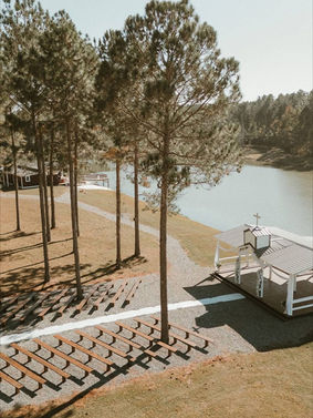 Located at the edge of the eight-acre pond with a beautiful sunset view. The Chapel by the Pond area has benches that hold 160-200 people. This area is located to the west of the Groom's Den.